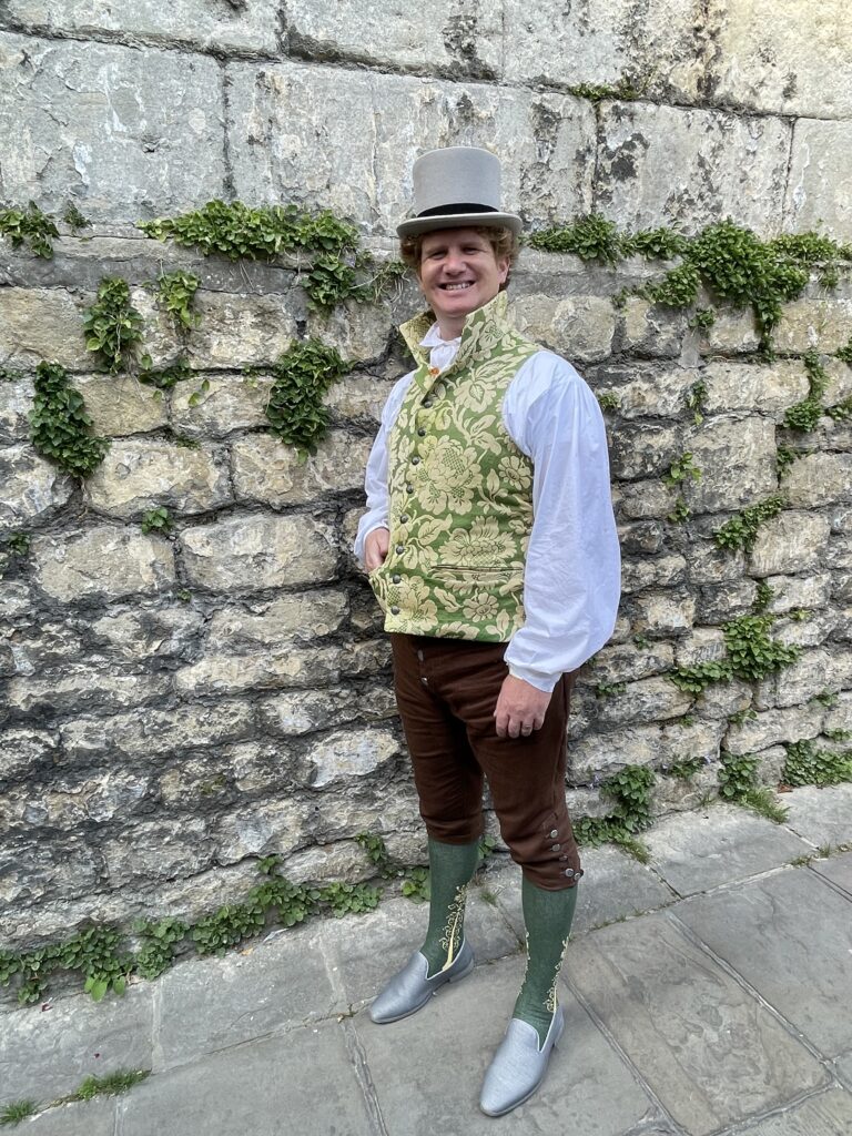 After returning to Bath each year, I grew more bold in my sewing desires. The first year, I made waistcoats. The second was breeches and coats. The third was embroidery, hats and fobs. The fourth was socks and a garrick. Eventually I had made an entire wardrobe. My new goal was to use this wardrobe.